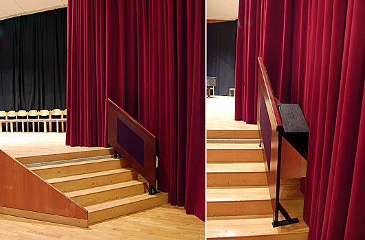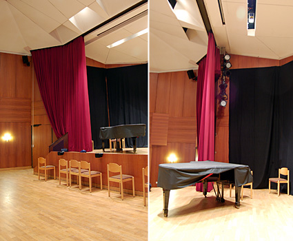 Bei der Lichtanlage sollte auf altem, bestehendem Material aufgebaut werden. Wir ersetzten die alten Heizungsstahlrohre der Seitenversätze durch Aluminium-Dreieckstraversen, die wir hochkant auf die Wände setzten, um das Deckenbild nicht zu stören. Auf der Bühne ergänzten wir das seitliche Licht durch Dimmerbars, welche leicht demontierbar und somit auch in anderen Räumen des Hauses einsetzbar sind. Über der Bühne installierten wir Fluterbars, integriert in die Bühnendecke.