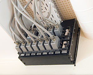 Das linke der beiden Bilder, die Sie hier sehen, zeigt eine so genannte Gruppen-Hot Patch; hier können einzelne Lichtgruppen von je 12 Kanälen jeder verfügbaren Licht-Endstufe zugeordnet werden, was im Falle des Ausfalles einer Licht-Endstufe nötig werden kann. Eine Neuzuordnung von Lichtgruppen zu Licht-Endstufen ist so sehr schnell und einfach realisierbar.