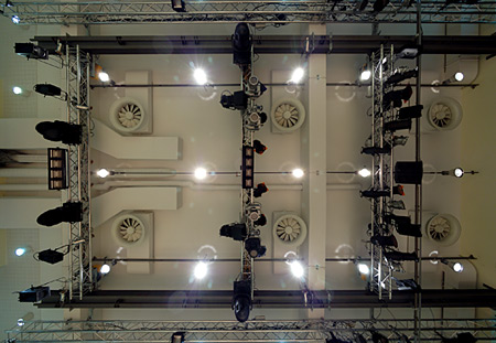 Im Saal des Bürgerhaus Kalk befinden sich über dem Publikumsraum 3 motorisch gefahrene Lichtgerüste aus 4-Punkt-Traversen mit jeweils 2 Motoren.