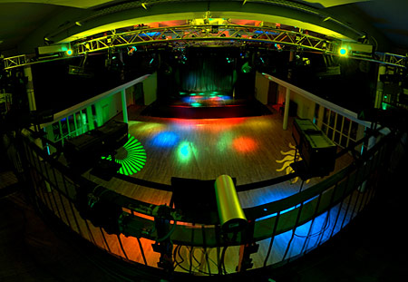 Bei einem Rundblick durch den Saal (den Sie mit dem Cursor und gehaltenem Linksklick vornehmen können) fällt auf, daß etwas nicht auffällt, nämlich die Tonanlage bzw. Lautsprecherboxen. Die Boxenbestückung des Saales wählten wir, wie auch schon in anderen Sälen, dezent aber leistungsfähig. Um den Geldbeutel des Auftraggebers zu schonen, nutzten wir vorhandene 15/3er EV Boxen und bauten sie zu geflogenen Subwoovern um, die wir mit natürlich ebenfalls geflogenen Hochmittenelementen einer KS Signum Anlage kombinierten; ungewöhnlich, aber klingt. Das Portal wird mit einem Mittencluster aus 2 KS CL108 gefüllt, die sich schön dezent an der Decke verstecken. Für den Bass sorgt unter der Bühne ein prozessorgesteuerter aktiver KS TW Subwoover und bei Bedarf noch 2 weitere Bässe einer KS Signum Anlage. Die Anlage kann je nach Einsatz konfiguriert werden.